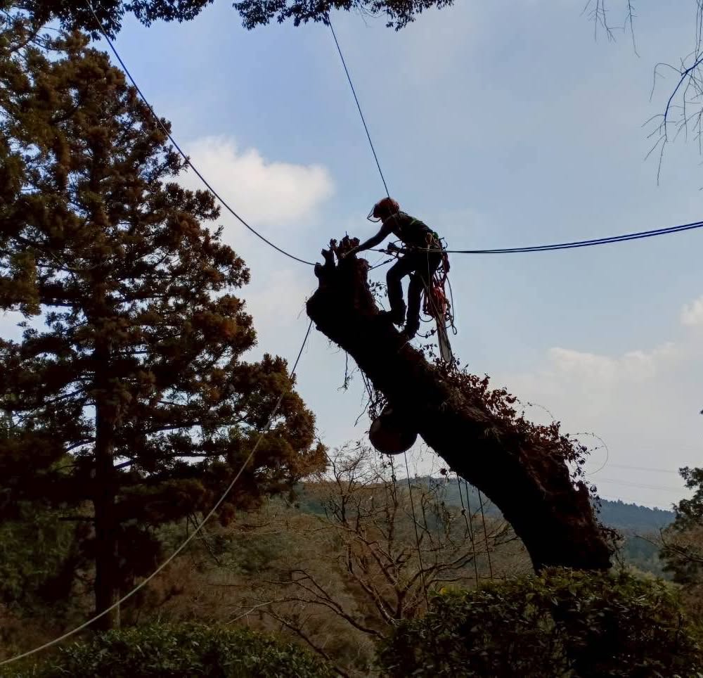 【ツリークライミング伐採】傾斜地の腐朽木をリギングで安全施工!(佐賀県鳥栖市・大興善寺)🌳
